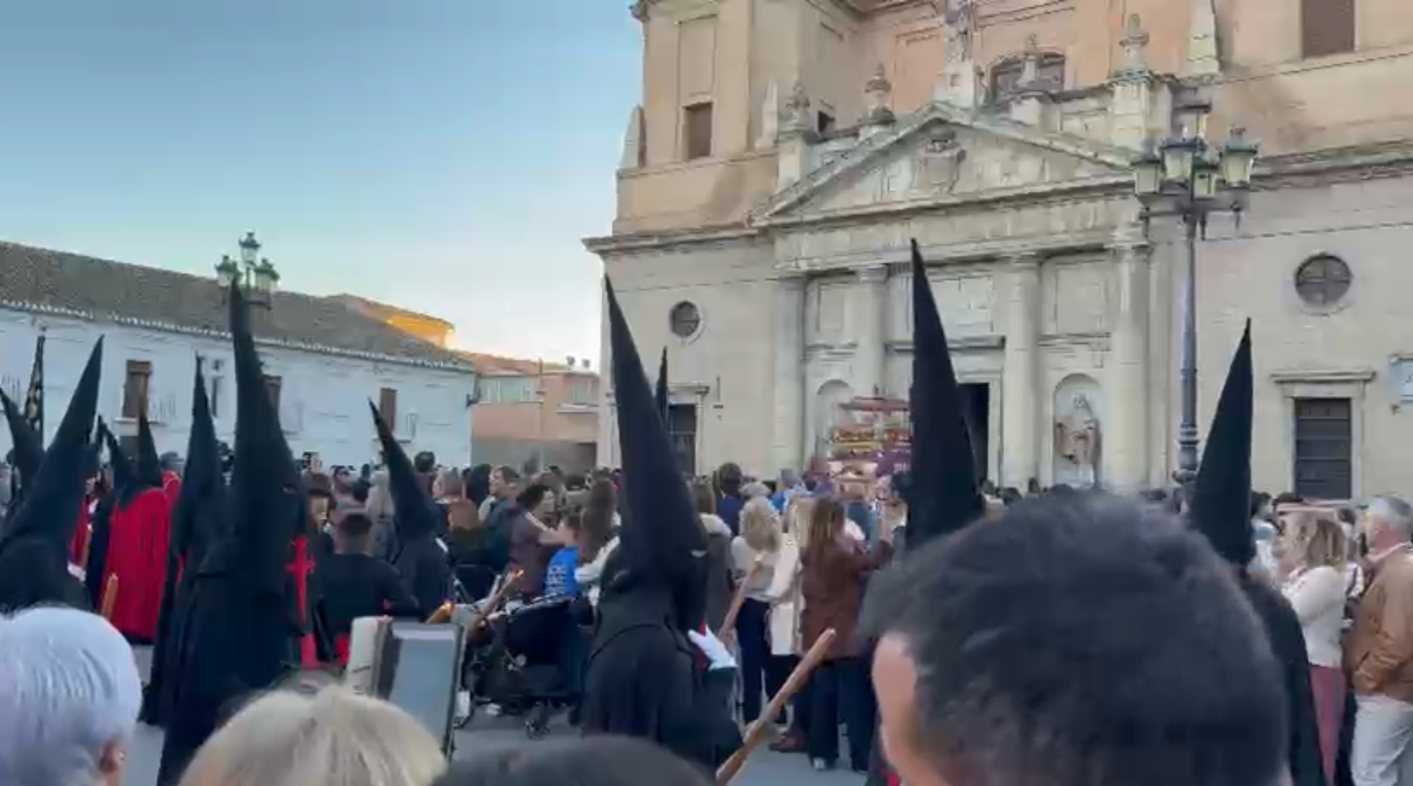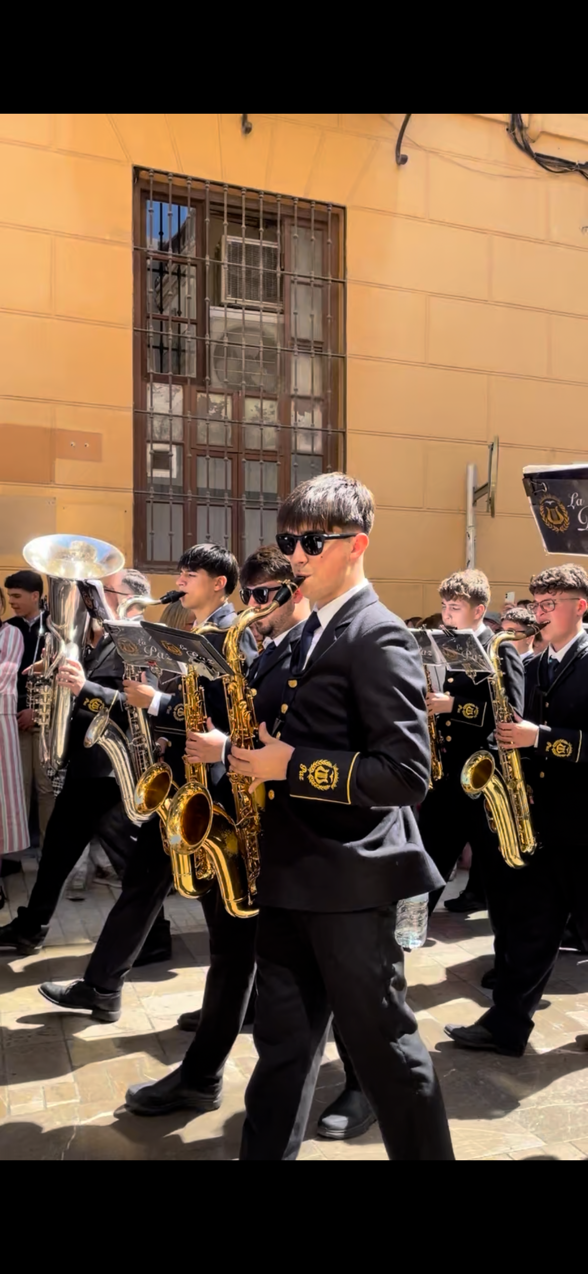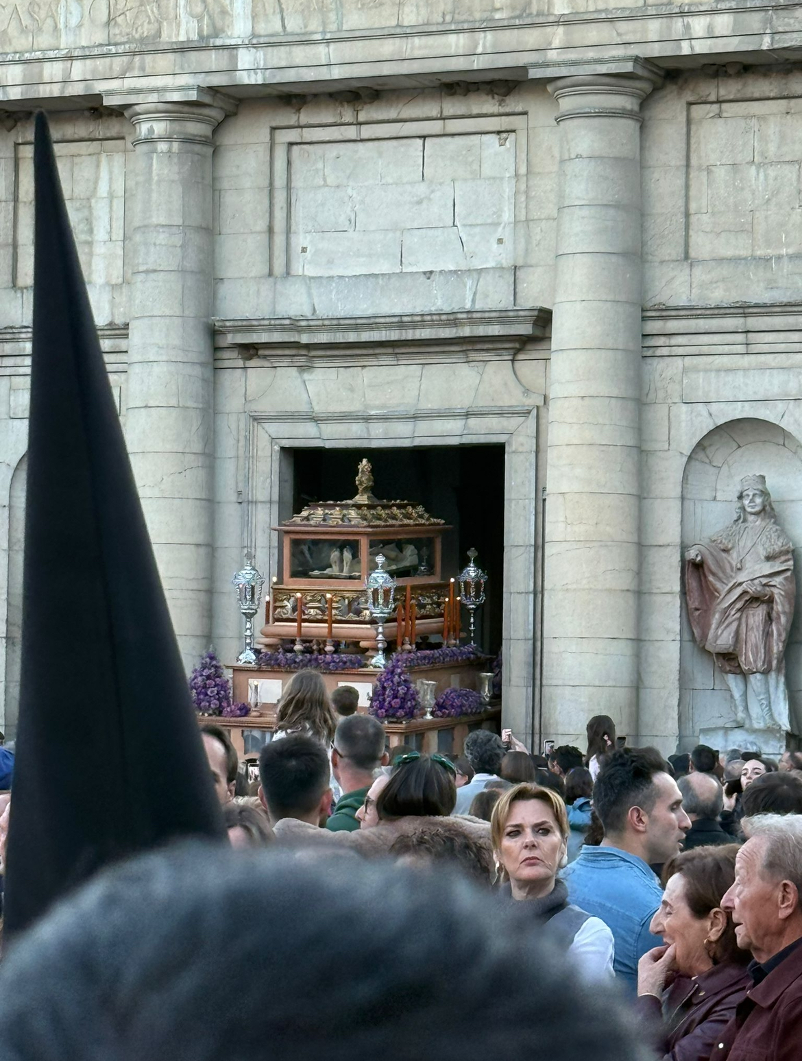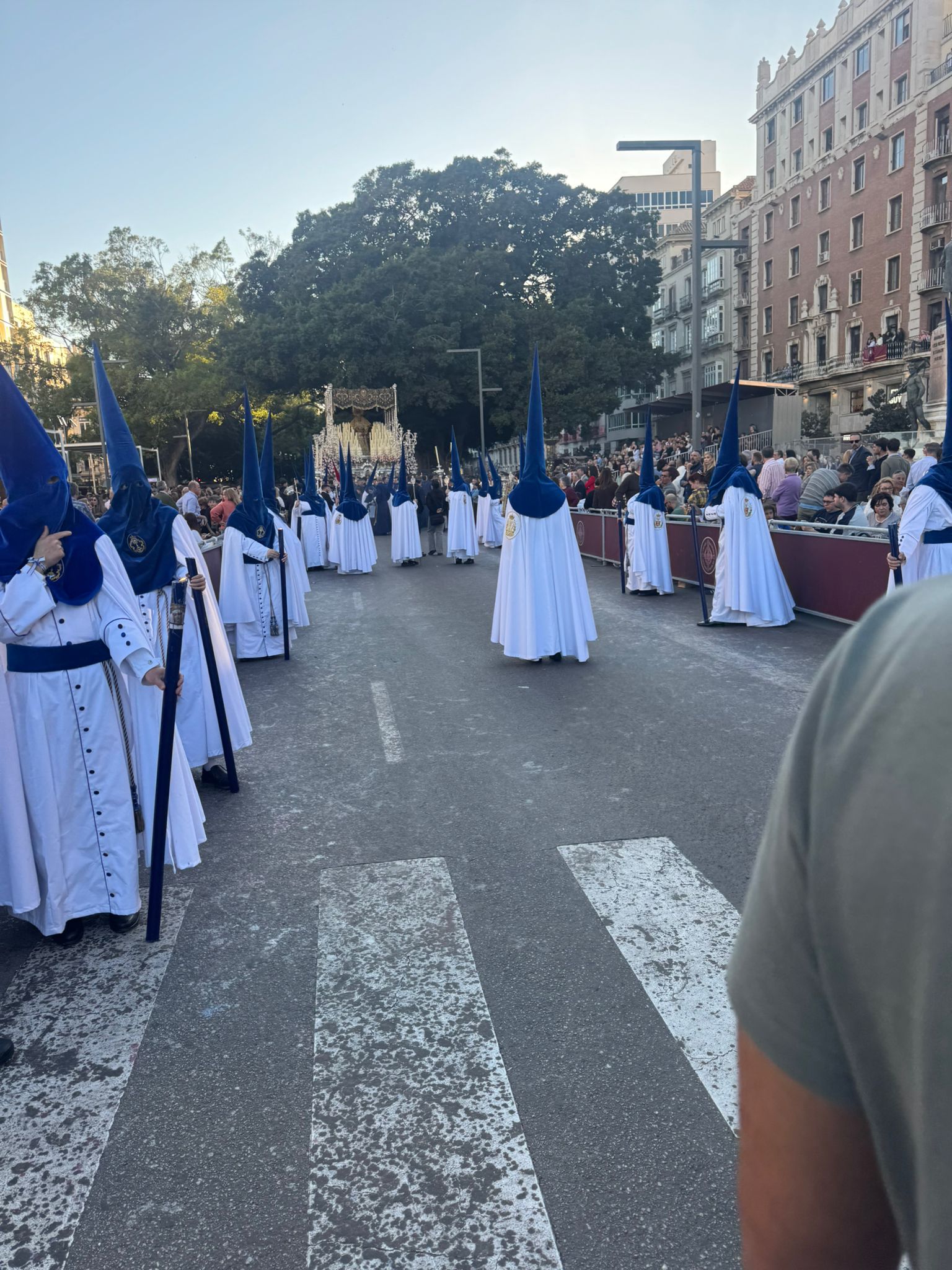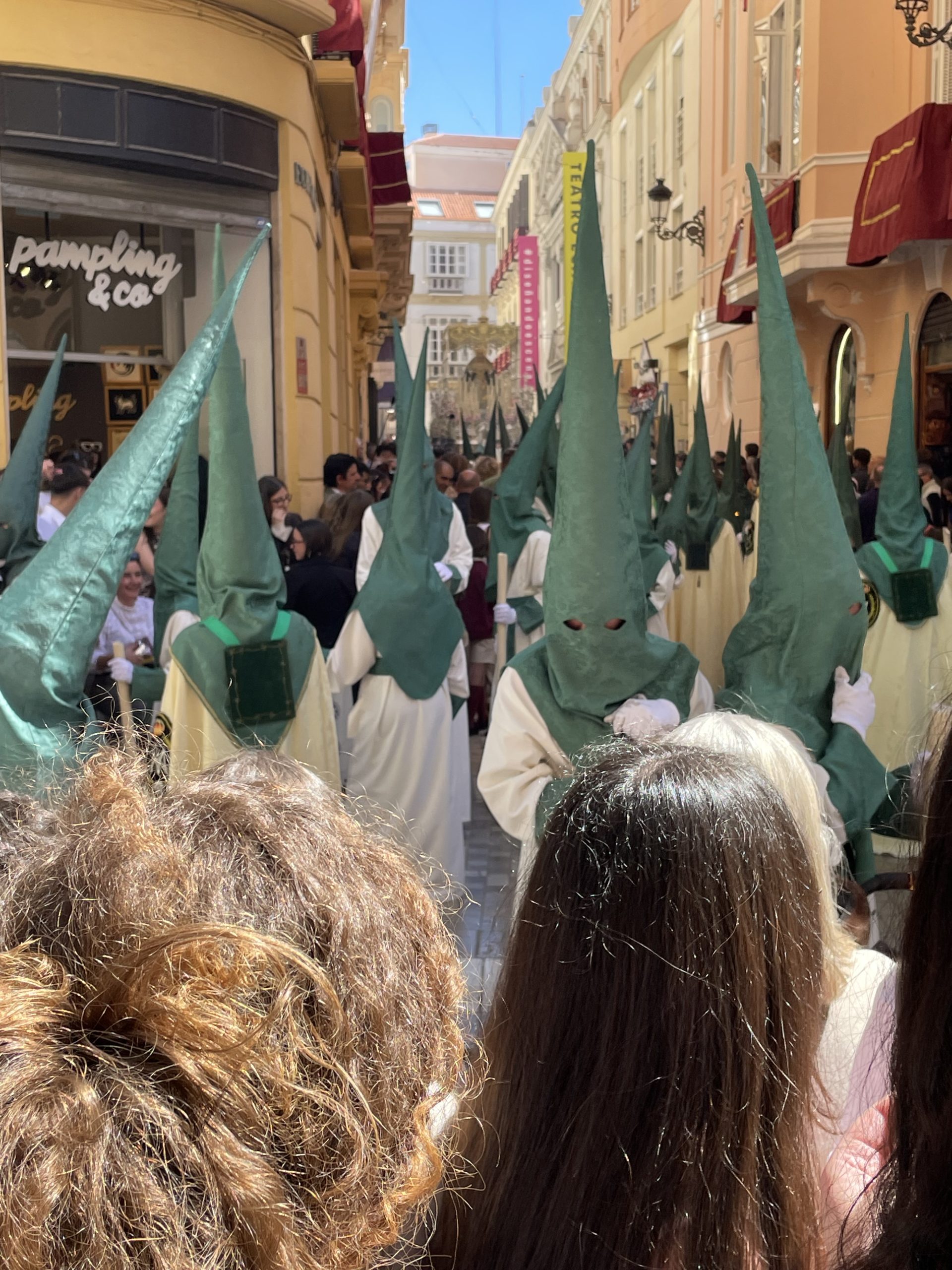 さてこの日はキリスト復活祭、イースターの聖週間/Semana Santa 始まりの日。マラガはカトリック教であるスペインの中でも盛大に復活祭をお祝いする所だそうです。そのような知識は全くなく。。長男に「明日からは街がすごいことになる」とだけ聞いていました。洞窟見学を終えマラガ市内に戻って早速そのお祭りを見に行ってみることにしました。滞在先から地下鉄の終点の駅に降り立ちました。乗客はみんなさんジャケットを羽織ったり、女性もきちんとしたスカートを履いていたり、小綺麗にしています。聖週間の初日でも教会近くは大勢の人々が石畳の小道に立っています。ブラスバンドの音が響いている方向に行くとこれまでに見たことのない光景が。。。
