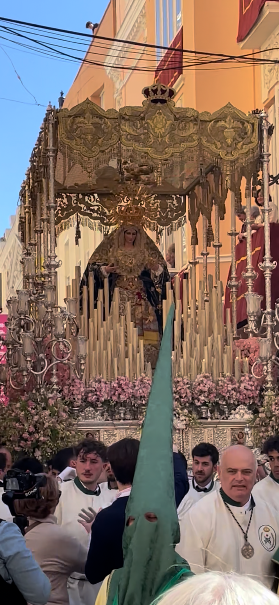本当に驚きました。色々想像してしまいましたが、こちらの装束の歴史は長く600年以上前から続くものだそうです。次に女性がお香を焚き、道を清めながら歩き、そして涙を流したマリア像を載せた大きな山車が続きます。お神輿と同じように肩に担いで横に揺れながらゆっくりと歩いてきます。担ぎ手は全員男性。マリア様を撮るつもりが、いつの間にかフレームアウトし担ぎ手のイケメン度チェックをしてしまっていた罪深い自分。気づくと正装をした隣の男性が胸に十字を切り静かにお祈りをしていました。そしてその横を見るとやはり静かにお祈りする女性の姿。山車の後ろはブラスバンドが演奏しながら整列して続きます。お祭りと言っても誰も声をあげることなく黙々と歩いていくこの行列(プロセシオン)は日本のお神輿を担いでいるときの活気とは真逆でした。私の見た限りでは日本のように若者がグループで信仰心とは関係なくお祭りを楽しむ様子もありません。街全体がこの1週間のために一体化して動いているように感じました。畏怖と尊敬の念がプロセシオンに向けられて一心に同じ方向へ向いている。その姿に圧倒され感動しました。