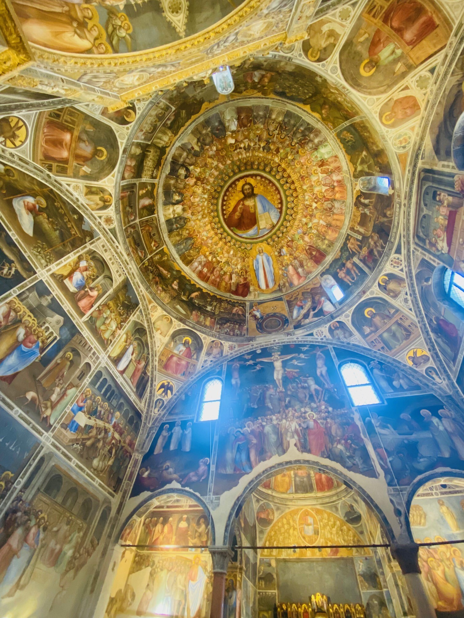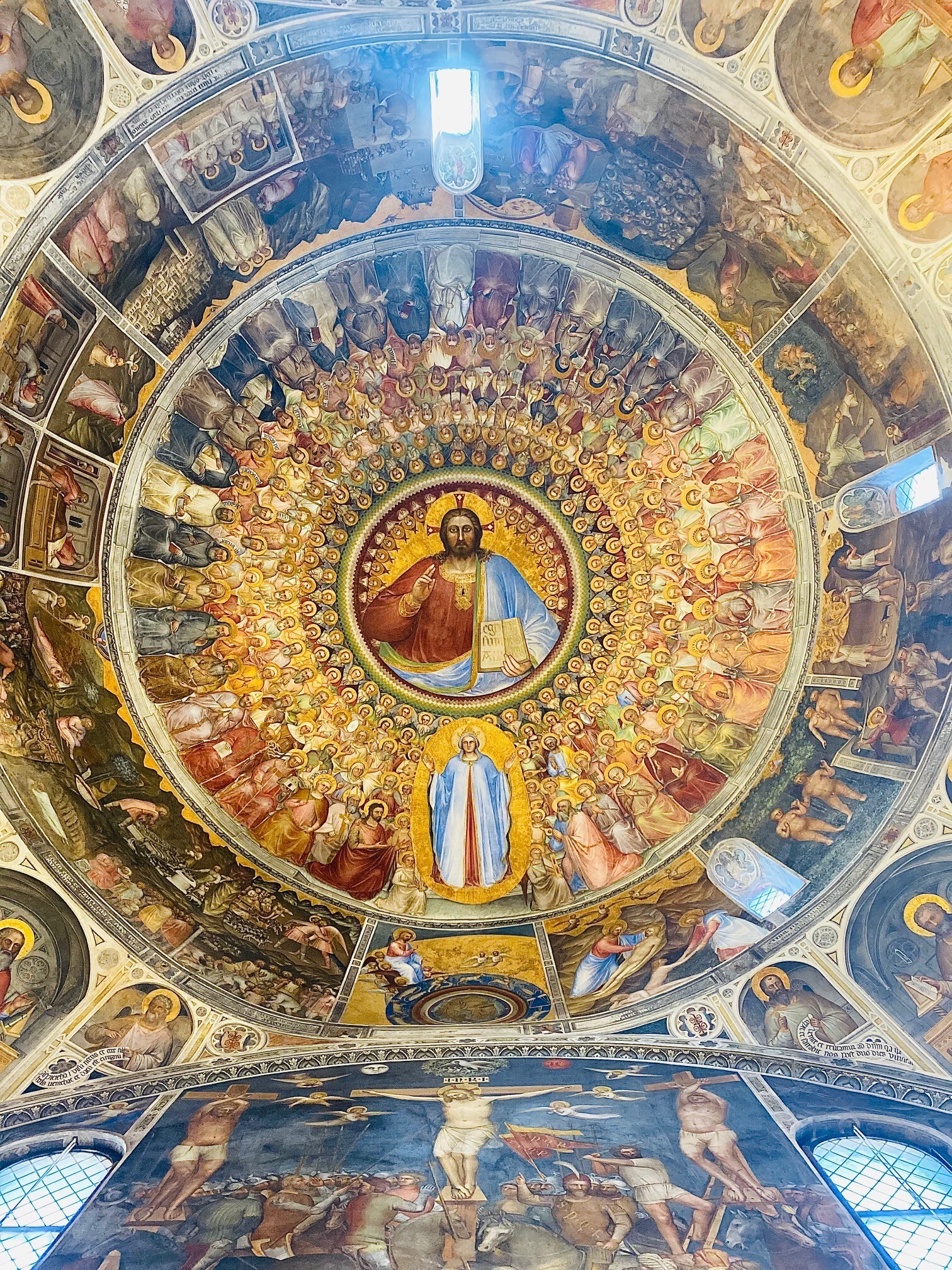 びっしりと金色をたっぷりと使い、天井のイエスキリストとそれを囲む無数の天使と聖人のフレスコは、圧巻です。