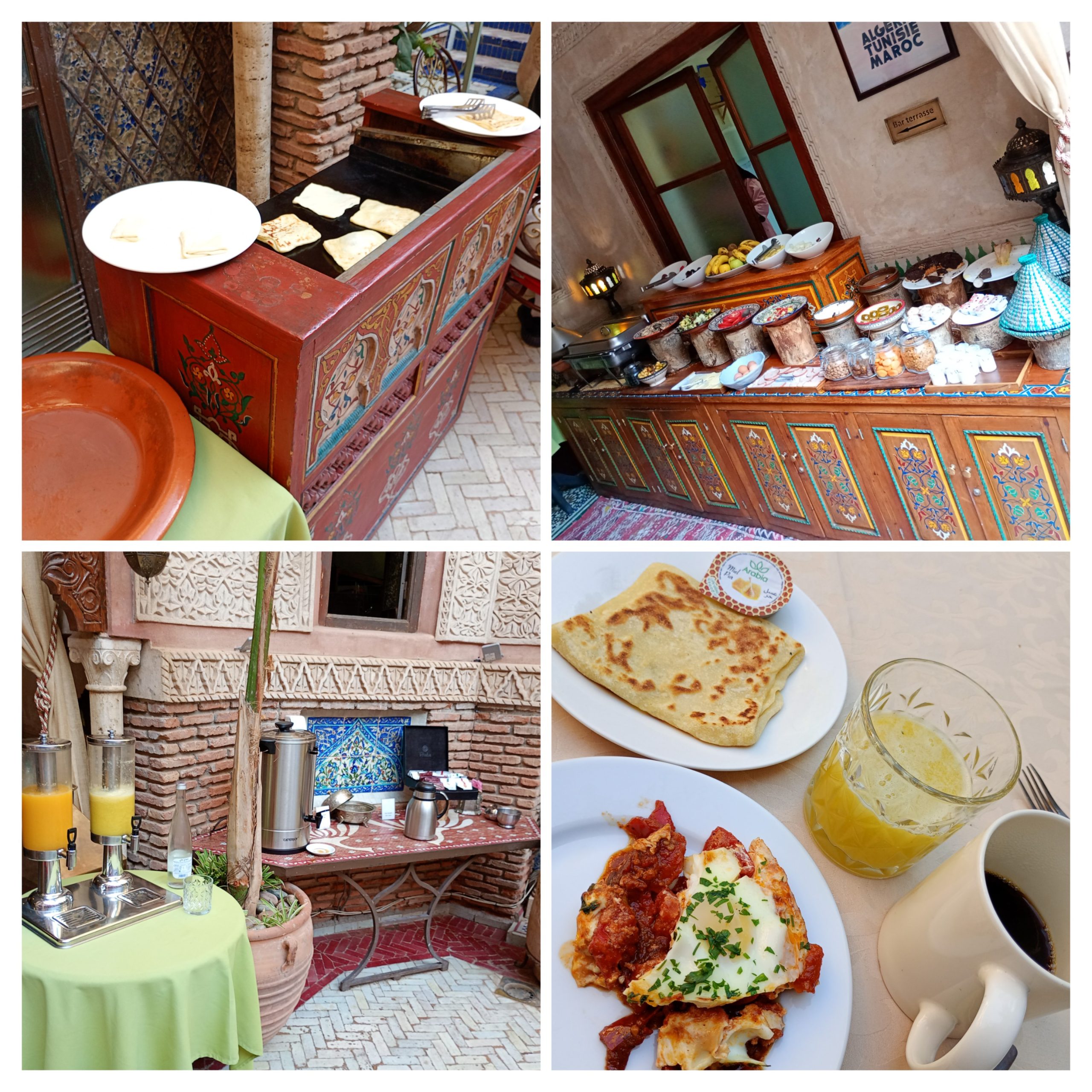朝食では、モロッコのクレープを焼いてくれます。ほんのり甘くて美味しかったです。buffet Menusも日替わりで色々と楽しめました。